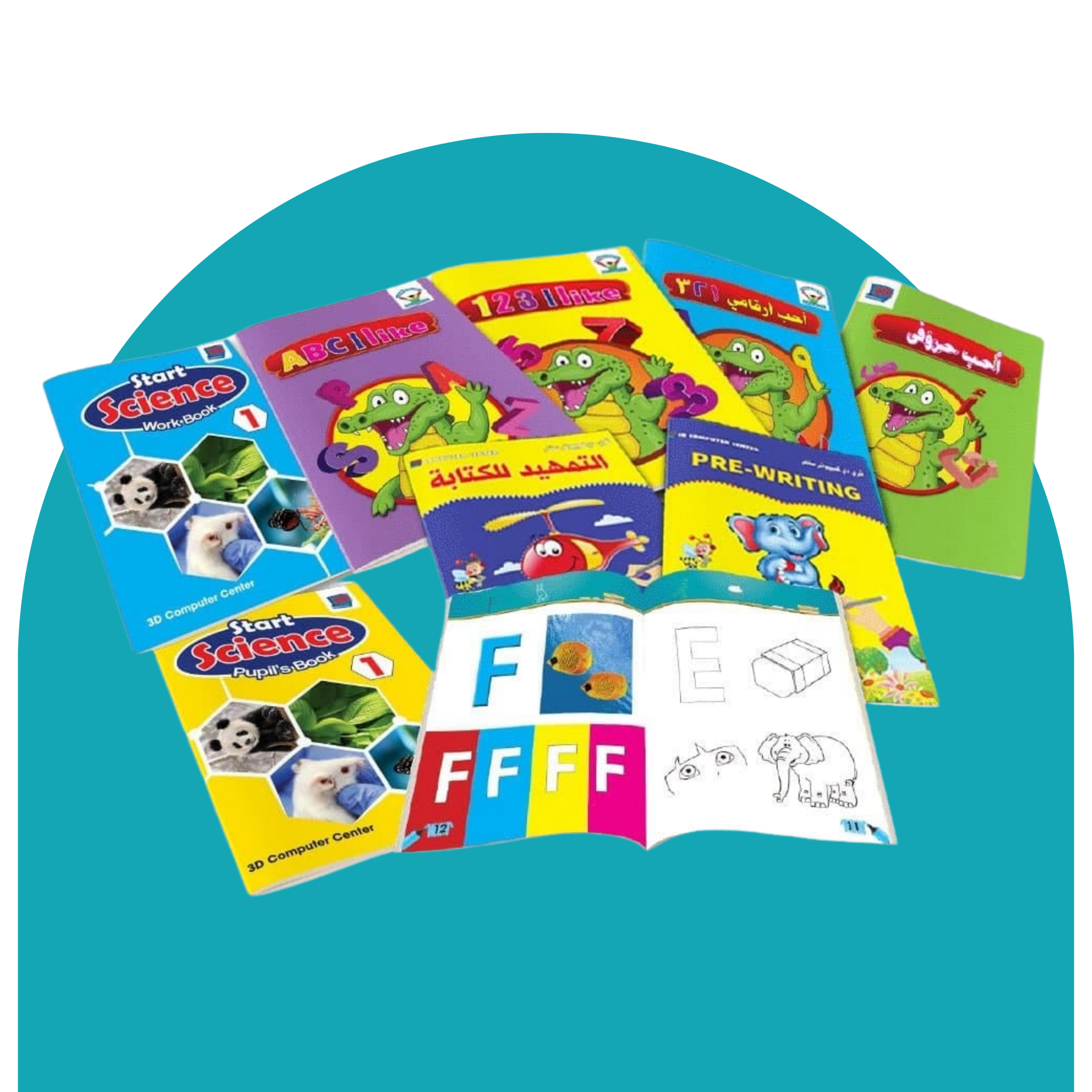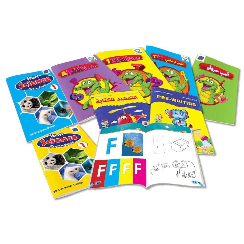 تتضمن مجموعة كتب ما قبل المدرسة الكاملة 8 كتب: 3 كتب باللغة الإنجليزية، 3 كتب باللغة العربية، وكتابين في العلوم.